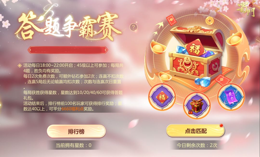 活动内容:活动期间,每日18:00-22:00可以有2次免费参与答题PK的机会,与匹配的对手一较高下!相较于题目的难易程度,手速更是关键,不管胜利与否都可获得灵力、仙魂奖励。