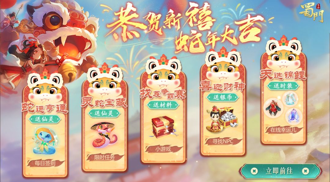 新春脚步将近,各地都已经换上新年的装饰,蜀仙盟当然也不例外!除了一对蛇年定制的暗金仙灵免费赠送之外,还为大家准备了十大福利活动,与您在蜀仙盟共度新春!