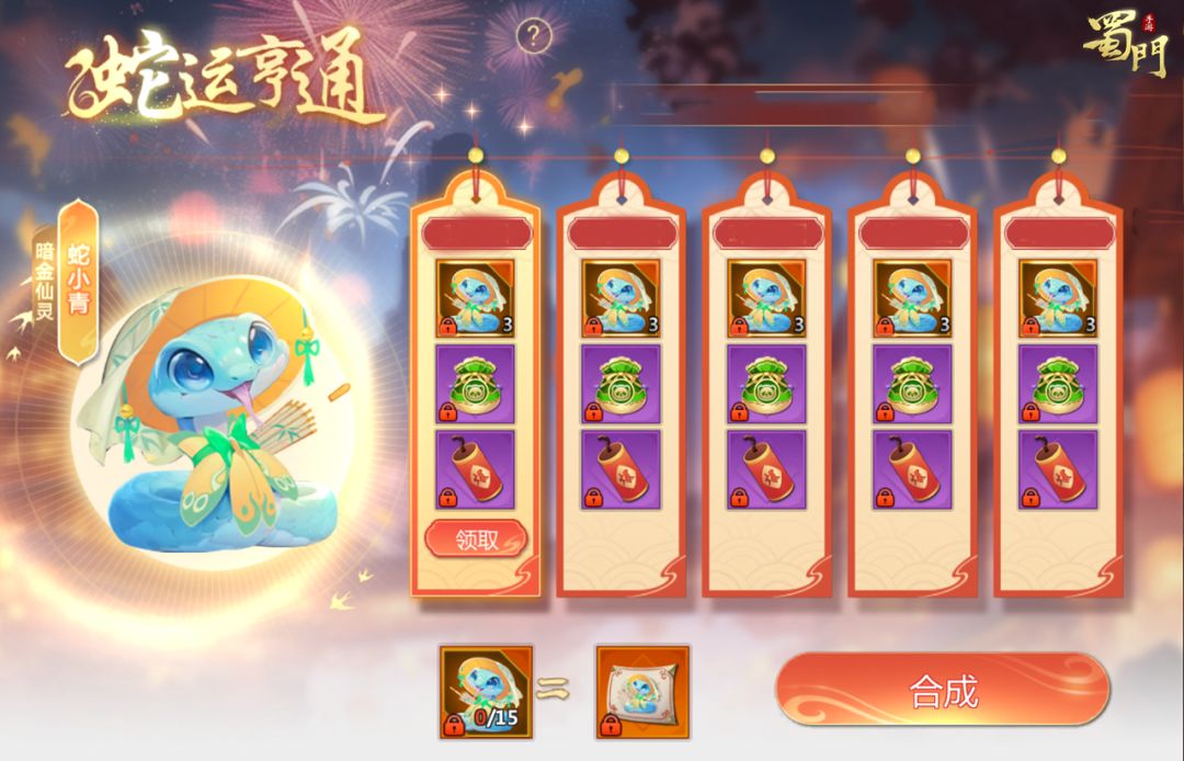 活动内容:新年暗金仙灵相伴!在活动期间,每日登录游戏即可领取暗金仙灵蛇小青碎片*3,仙灵共鸣包*1,春节爆竹*1,连续登录5天累计获得15个仙灵碎片即可合成永久暗金仙灵蛇小青。新的一年有灵蛇相伴,必将带来好运连连!如错过也可使用少量钻石补签。