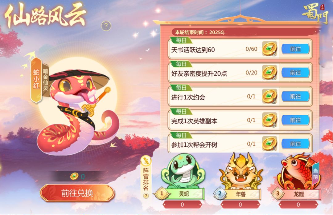 活动内容:在活动期间,全服玩家将会被随机分配至灵蛇、年兽、龙鲤中的任意一个阵营,完成日常任务就可以为自己的阵营获得累计积分,最终获得积分最高的阵营还将获得对应阵营的超可爱仙章!活动分为多期,每期都会重新随机分配阵营,有机会可以获取所有的仙章哦~