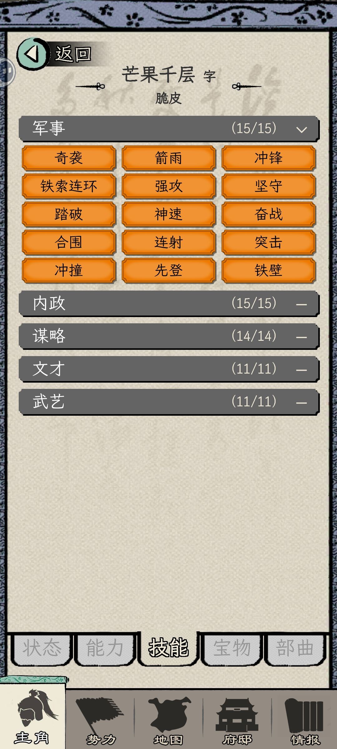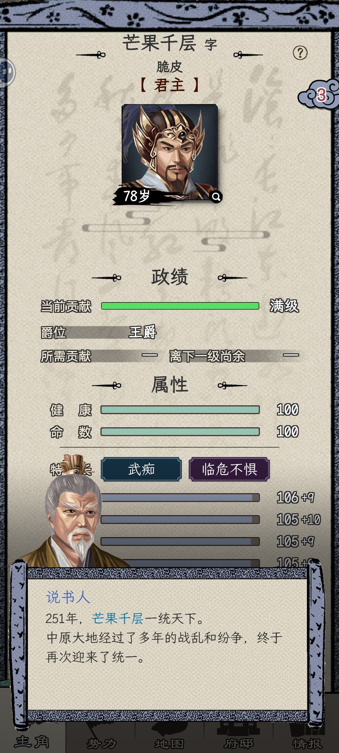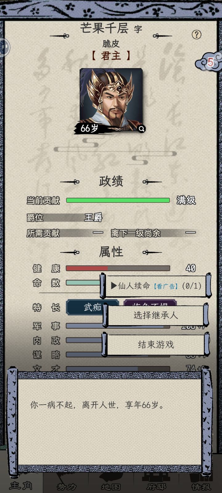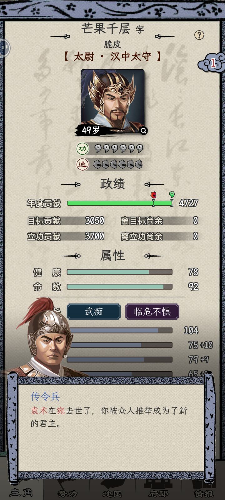 23.5小时一个档,感觉玩了好久应该不到一年,49岁才当上太守,后期属性技能部曲都满了感觉有点闲,岁数大了每年要找华佗针灸