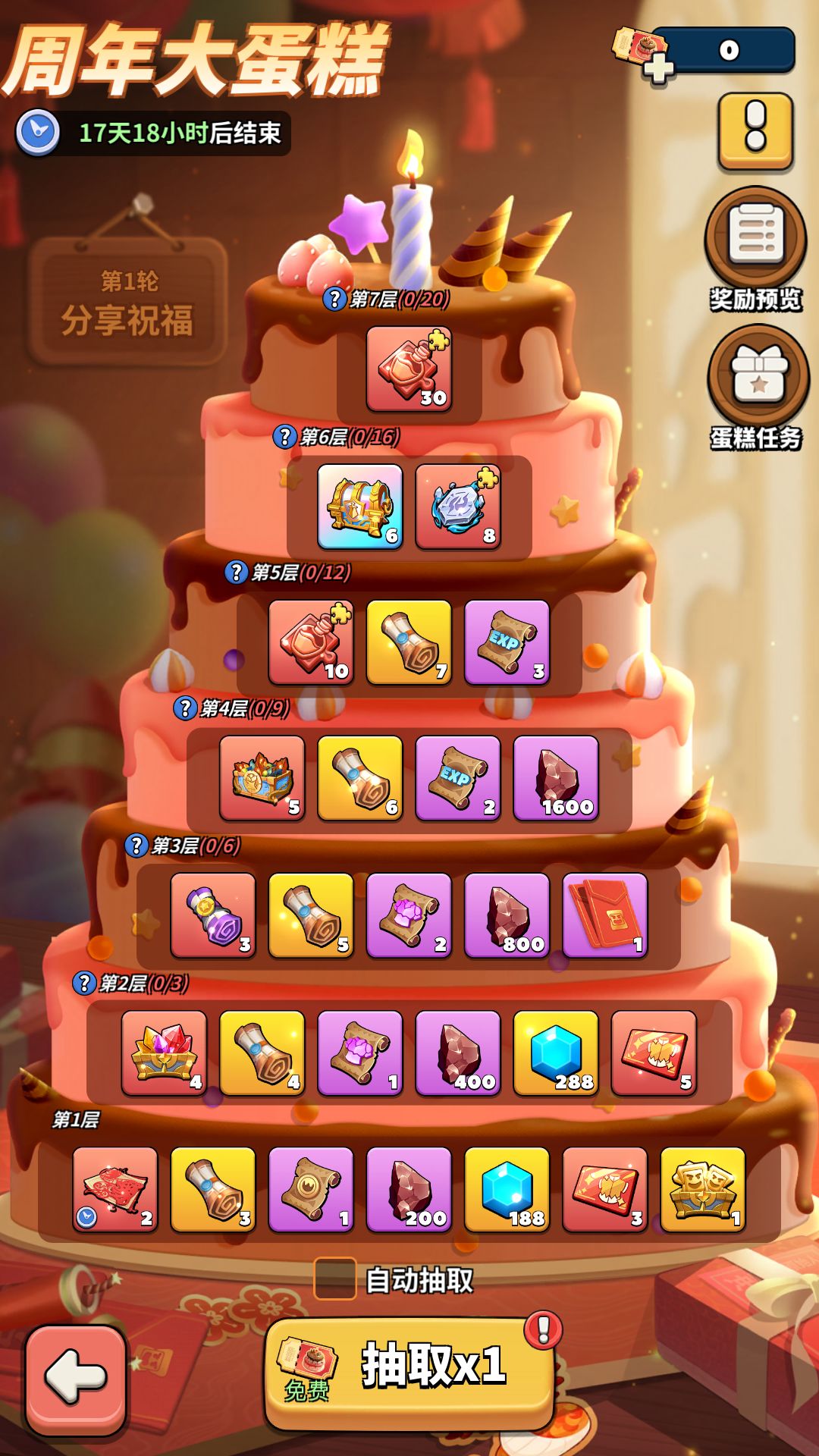 5. 前3轮蛋糕不可重置,抽到第7层大奖后,可自行选择继续抽取当前剩余奖励或切换到下一轮蛋糕。