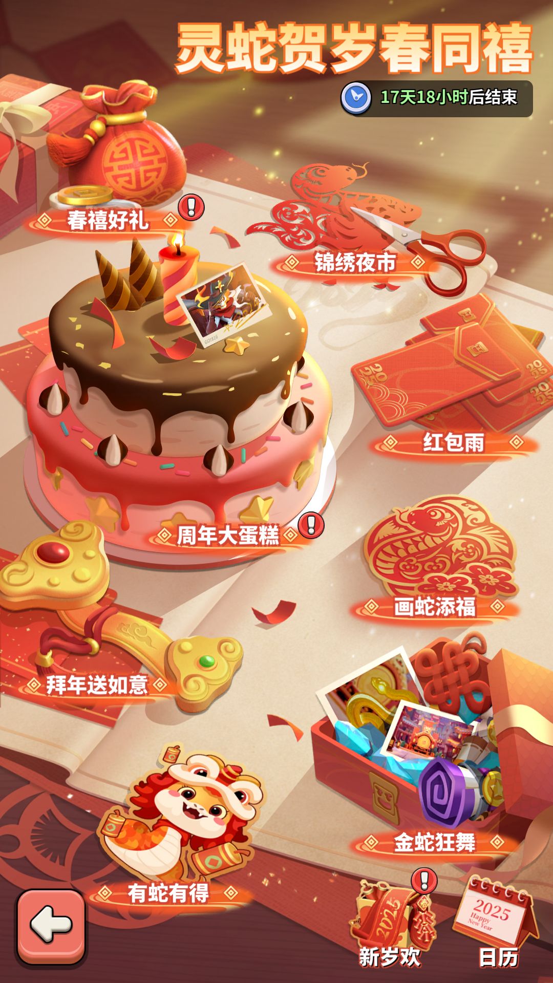 活动期间,每天登录即可领取新岁欢奖励,领蛋糕分享券、添福画片,集金蛇点数、获取小型红包雨!