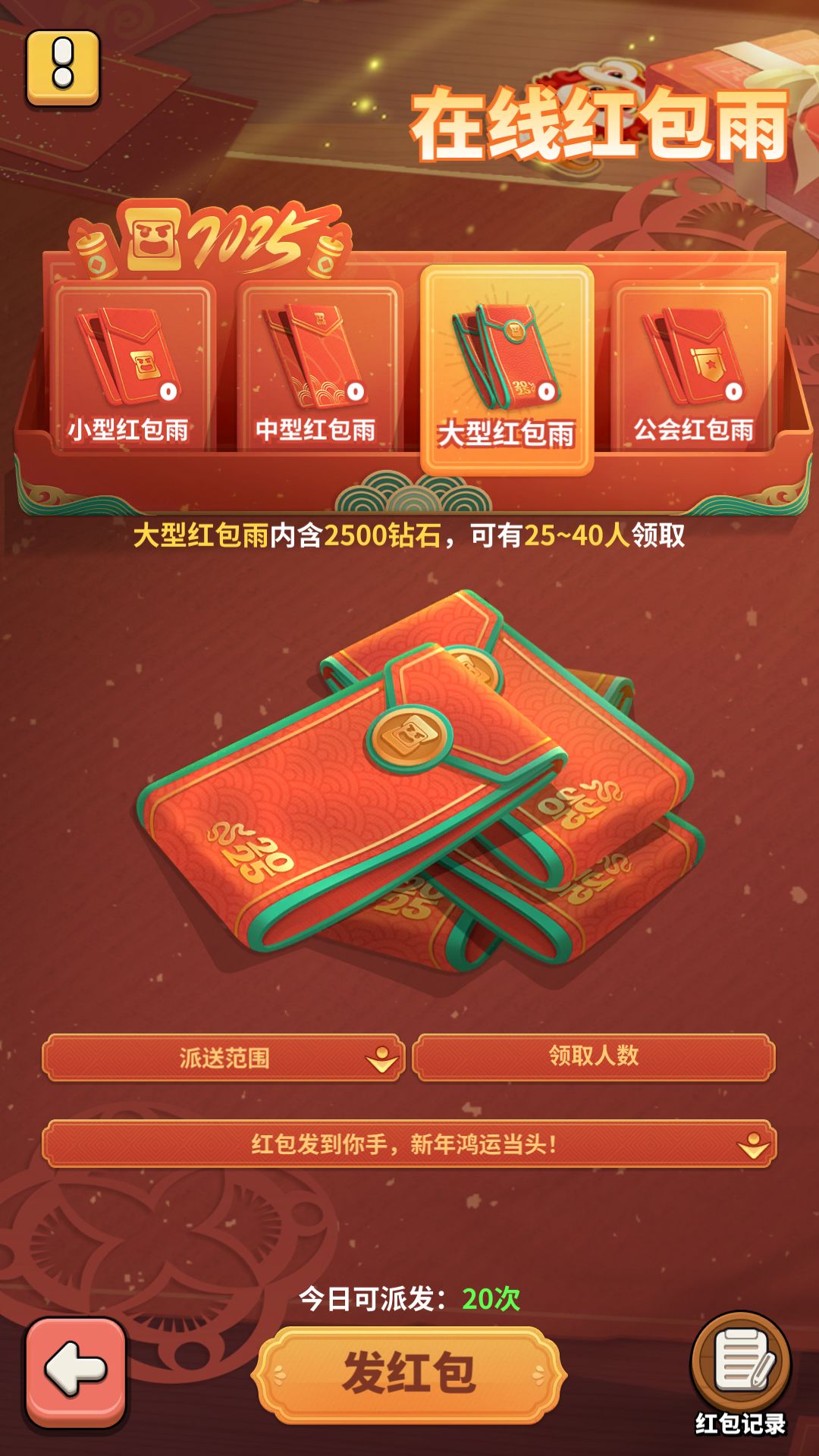5.每人每天可派送20次红包雨,4类红包雨共用该限制,未用完的次数不累积,每天6点刷新。