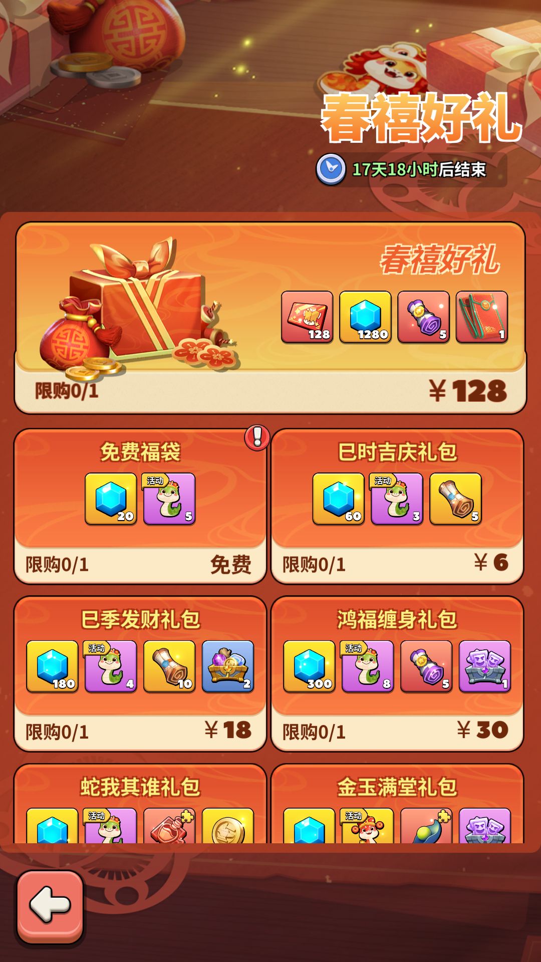 金蛇礼包的奖励需要付费解锁后,才能领取。解锁金蛇礼包时,直送1000点金蛇点数。已经解锁金蛇礼包、在活动结束前48小时还未领取全部奖励的领袖,可通过钻石购买金蛇点数。