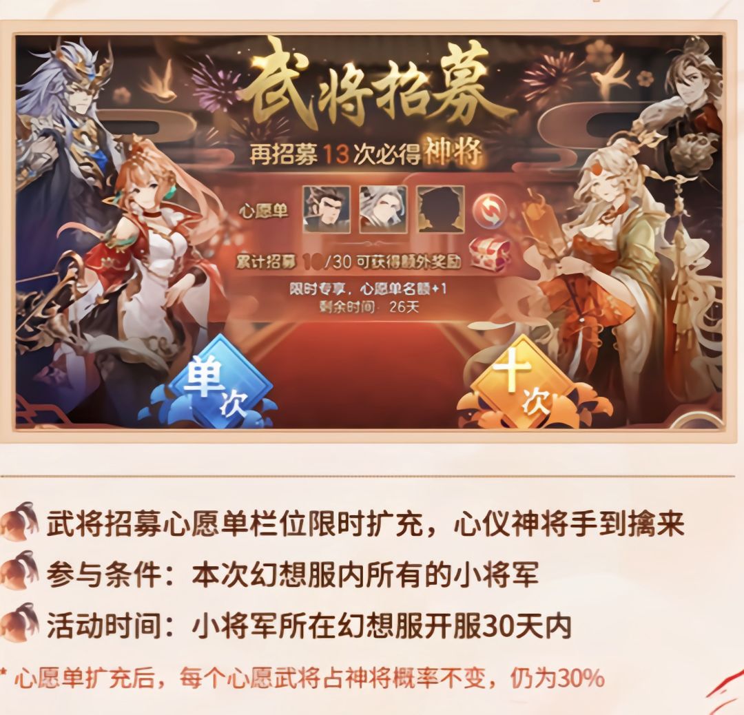 新一期的幻想服,心愿单是变成了三个格子,武将招募心愿单栏位限时扩充。所以我们优先抽完完100抽之后,开启心愿单。一般100抽之前都会出火烧或者女团队的个别角色。所以到时候缺哪个核心我们直接选择好再抽。