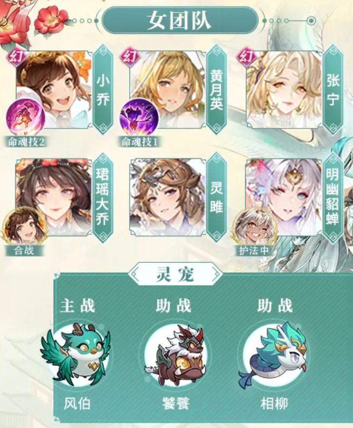 女团队:灵雎,大乔,貂蝉,黄月英,小乔,张宁