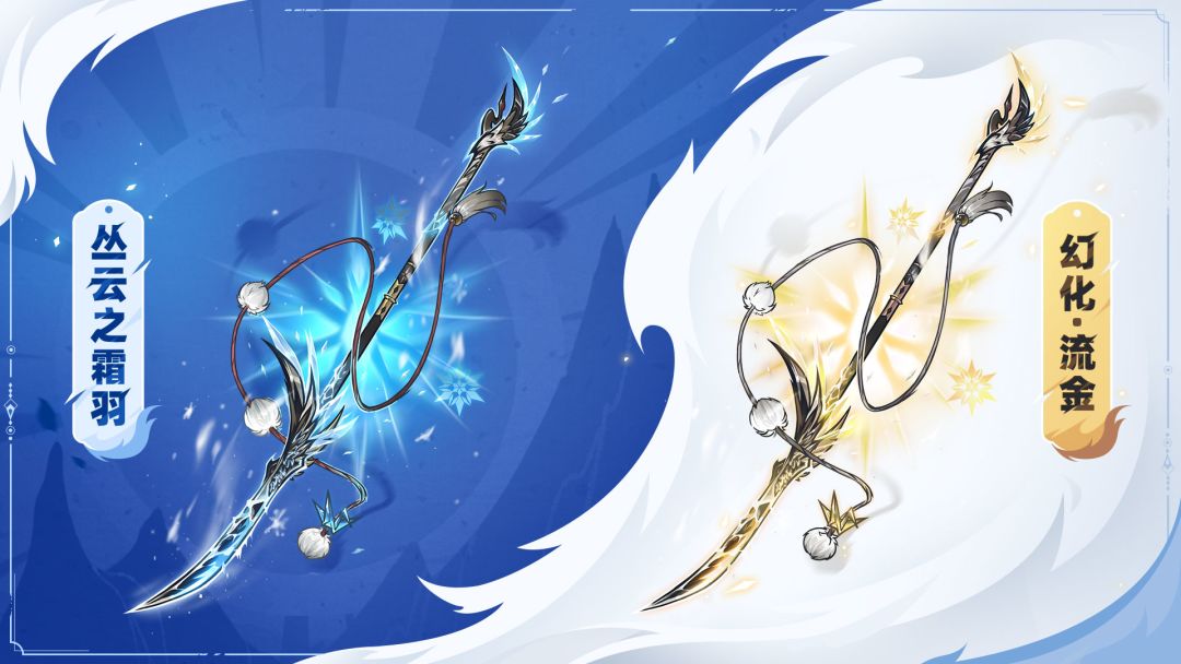 1月22日更新维护后,全新水系神兵「丛云之霜羽」与它的幻化「流金」将共同登场,等待忍忍的召唤!
