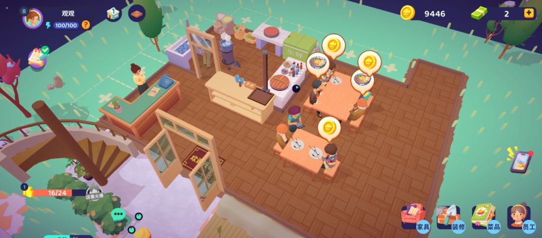 #新游试玩节 - 快速服务客人:前期亲自招待客人,关注客人头顶气泡,按点单、制作、收钱、清理的流程服务。积累一定口碑后,招聘服务员和厨师提高效率。