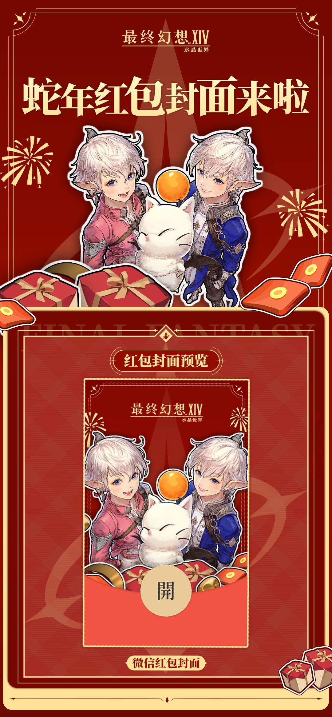 新春的脚步越来越近啦,在这新年即将到来之际,莫古带了一些《最终幻想14:水晶世界》的蛇年新春限定微信红包封面想要送给各位冒险者,祝各位冒险者新的一年好运连连,收获满满呀库啵!