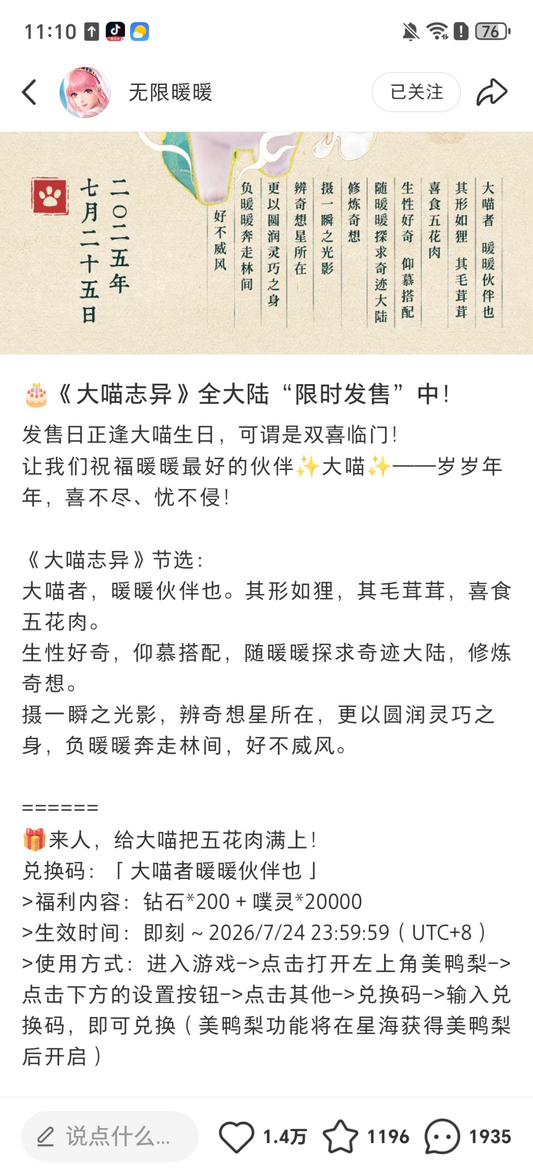 #无限暖暖兑换码