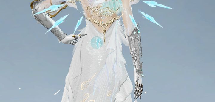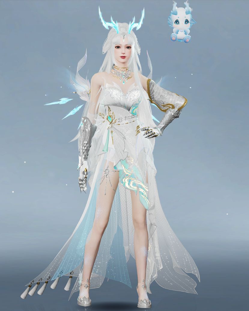 神兽降临,荣耀加身!「圣辉·苍蛟逸」时装包含头饰、衣服、手部、鞋子共四个部分。作为“神兽”系列的一员,这款时装充分融合了蛟的传说与形象。银色鳞甲流光溢彩、威风凛凛,以蛟的威仪与神秘为灵感,完美展现神兽风采。