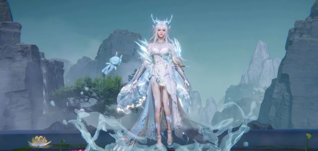 女款采用了抹胸长裙的设计,柔美与威严并存,蓝色云纹缠绕,手臂处的银色装饰更是增添了战斗的力量感。额头的蓝色蛟角和背后逸动的澜影构建了一个充满魅力的神女形象。