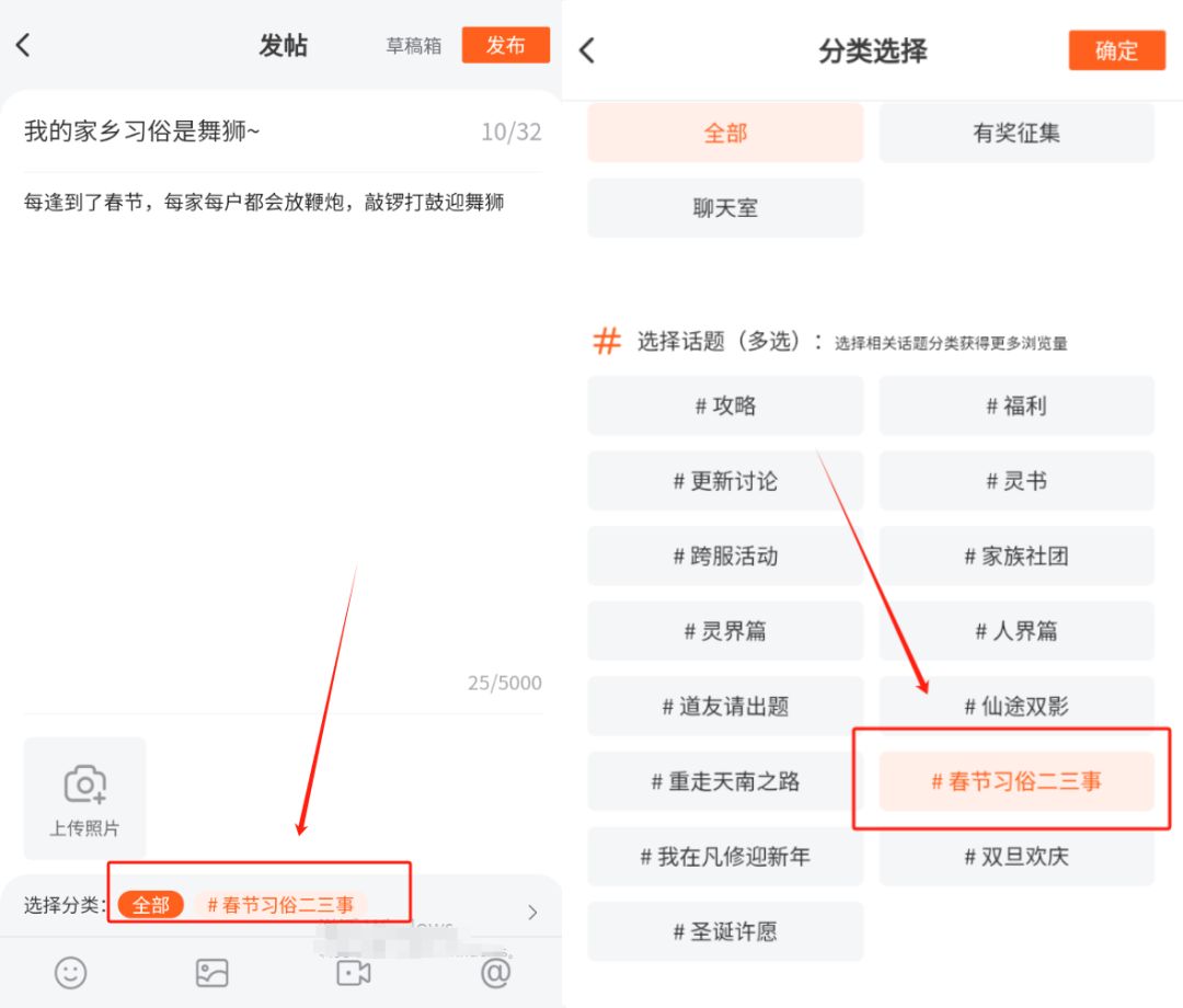 带#春节习俗二三事 话题进行发帖,分享家乡独特的过年习俗并附带个人角色信息,即视为有效发帖。