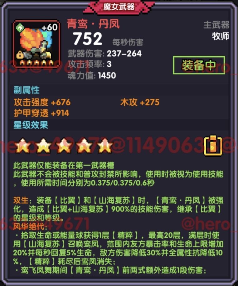 武器选择:青鸾·丹凤(魔女武器)+不朽穹峰(木位面)+无间熔荒(火位面)