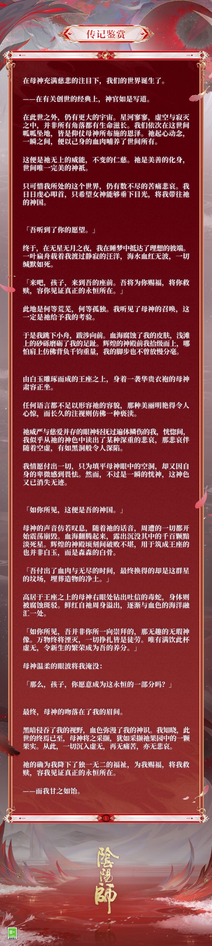 羽蛇在坍圮的神国中盘旋蜿蜒,神祇红唇轻启,信徒耳边传来毁灭的低语,沉入虚无见证真正的永恒......