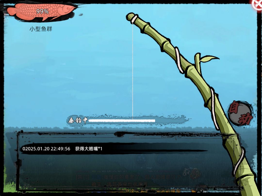 左上角左上角为鱼群血量,血量完之后鱼群消失,右边设有自动垂钓方便大家挂机,下方为信息栏显示玩家钓到了什么鱼。钓的非绑定鱼也可以拿去摆摊卖给其他道友,同时天道碑和主城酒楼也设有相应的NPC回收和卖鱼。这里再说一下,钓鱼有时候会钓出水系的一些妖兽和宝箱出来,所以挂机钓鱼时记得出战战力弟子,以免挂机被钓出的妖兽打死。