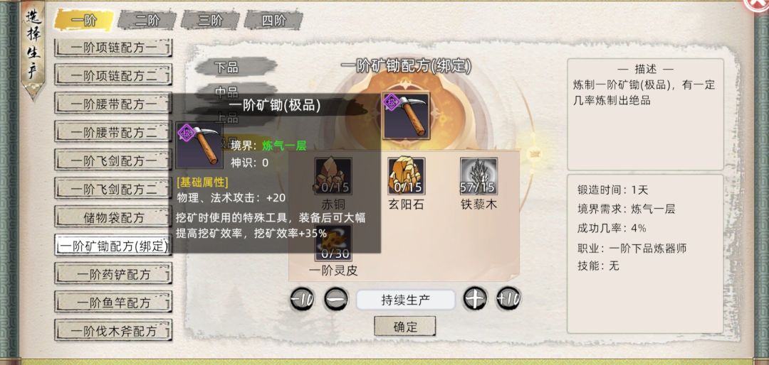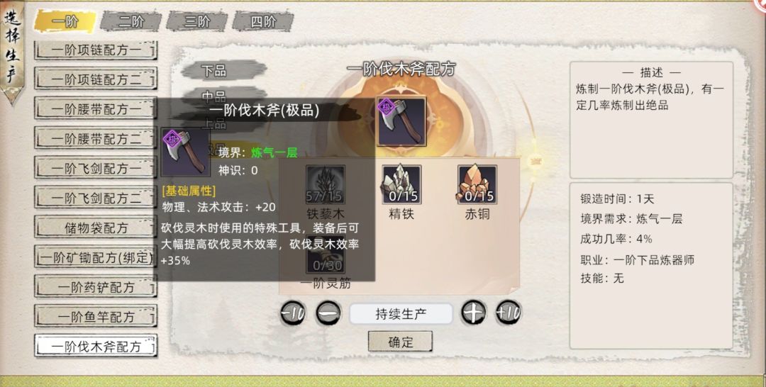 工具可以在炼器页面制作。必要的就鱼竿和矿锄,因为这两个采集时间大于找采集点时间,而且采集一次就一两小时,至于砍树和采药是找采集点时间大于采集时间,采集快慢个几秒并没有太大影响。