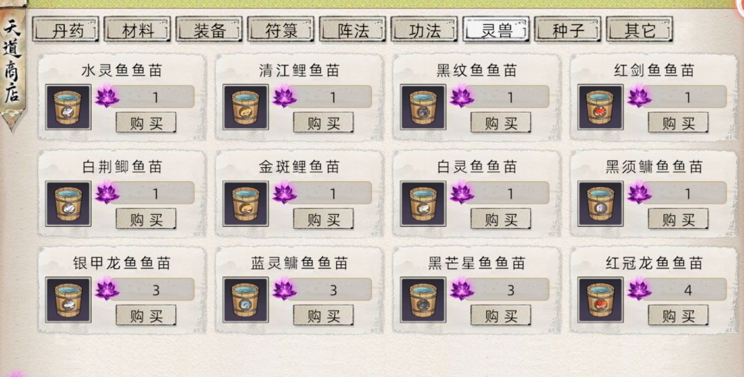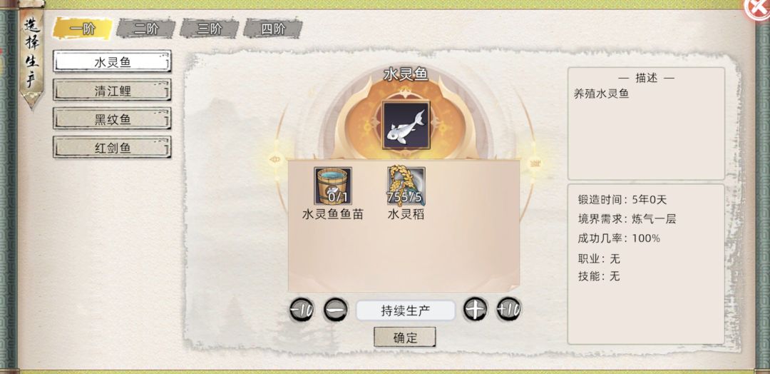 养鱼需要去天道石的天道商店买鱼苗,推荐有几个灵湖就每样买几个,然后灵田种植一些灵米类灵植,最后水灵鱼点击持续生产并安排御兽属性高的弟子工作就可以了,然后在弟子获得相关御兽职业后换另外的高级鱼养以快速提升职业,御兽属性影响养殖出变异鱼(增益比普通鱼更高)的概率和成熟速度。