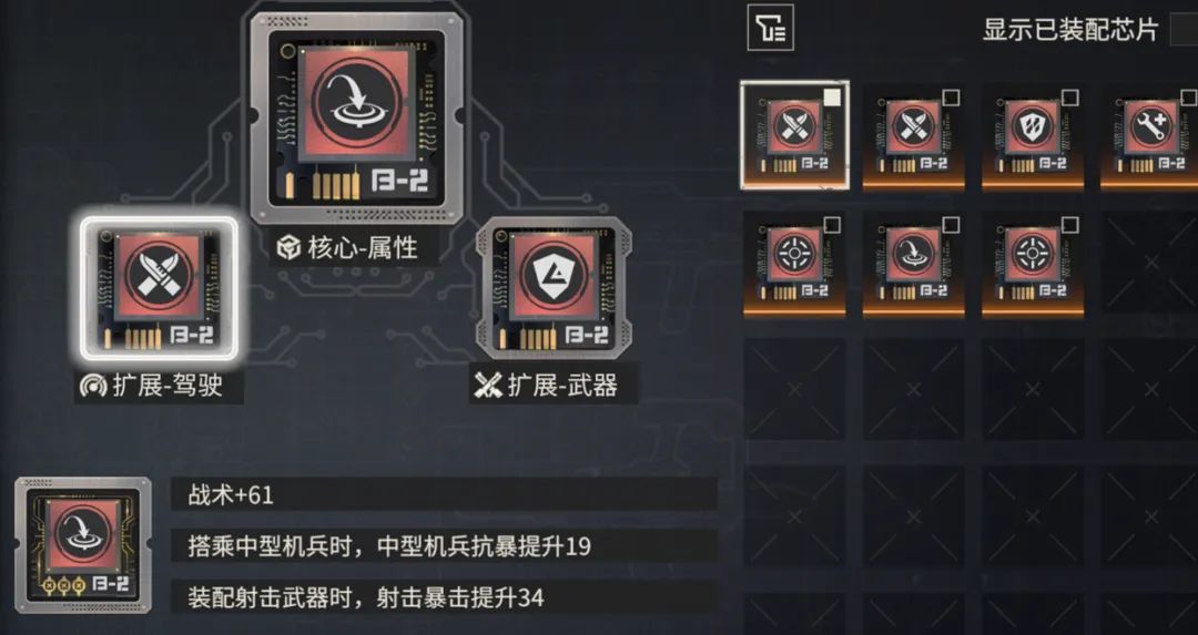 - 接着彩色SS芯片还会有两个副属性,例如上图中的红色芯片就分别写有“驾驶”和“武器”两个字样,这就要说到S芯片的词条类别了,因为S芯片本来的词条就可以分为“属性”、“驾驶”和“武器”三类,例如红色芯片的主属性就是“属性”,蓝色芯片的主属性就是“驾驶”,而黄色芯片的主属性则是“武器”,所以当我们合成SS彩色芯片后,属性、驾驶和武器的词条则必定会各有1条,这样加起来刚好就是3条属性,构成SS彩色芯片的基础结构,所以我们在选择提供副属性的S芯片时,就需要注意这些要点了