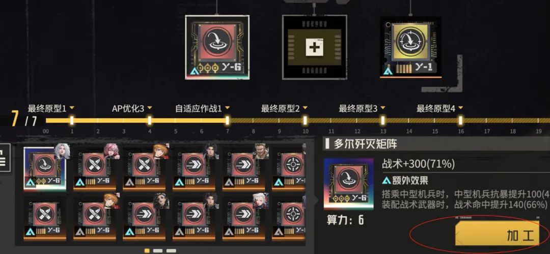 接着当我们合成了SS彩色芯片后,再次于人物的芯片系统中,便能看到刚刚的“跃迁”按钮就变成了“加工”按钮,此时我们便可以选择不同的S芯片来对刚刚合成后的三条属性进行加工,而大家在合成的SS彩色芯片的属性前会看到一个百分比的数字,这里就表示现在的SS芯片属性是占其属性上限的比例,简而言之就是合成后的SS彩色芯片,我们可以通过不断加入适配的S芯片来提升三条属性的值,最高都能提升到100%的上限。