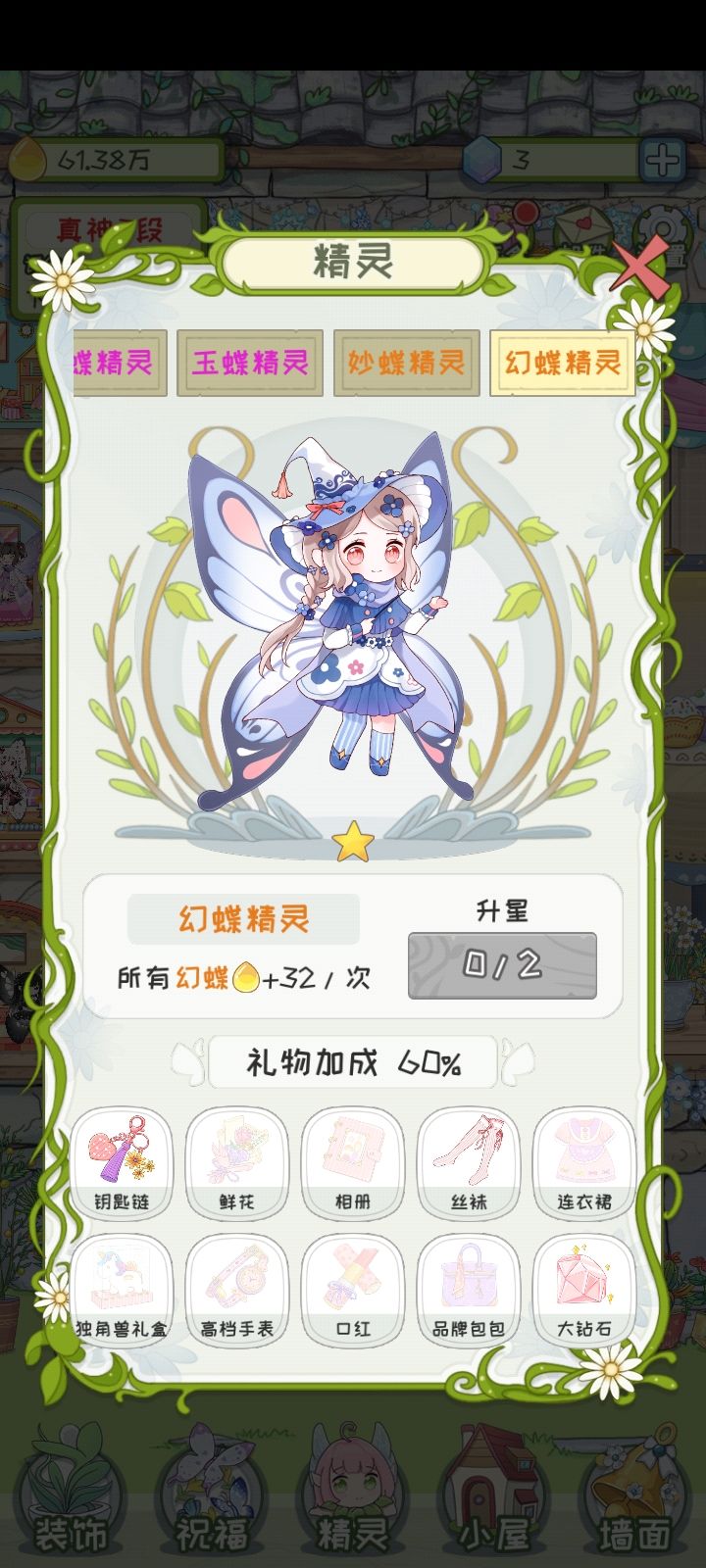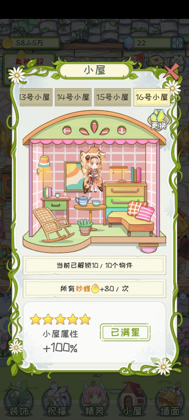 经过一段时间努力终于集齐了全部蝴蝶,全部建筑什么的都满级了,就差看脸的礼物跟升星了,就是这家的游戏都有一个通病就是看广告不能切走不然零收益,没了好几次差点血压都高了,可惜不更新了直接出二了