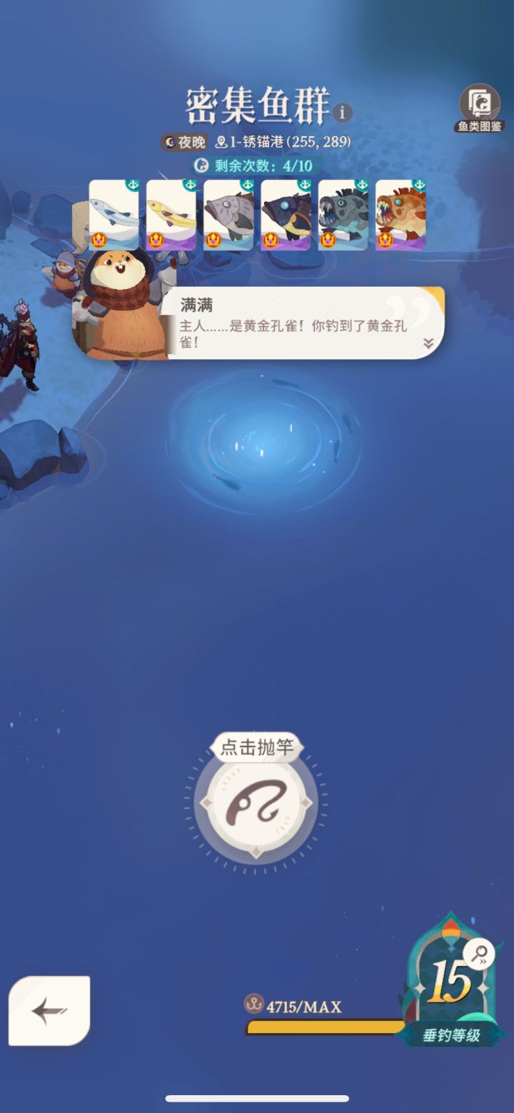 钓点如图,在晚上钓,10次里的第6次就钓上了,钓上以后满满会和你有段对话,然后