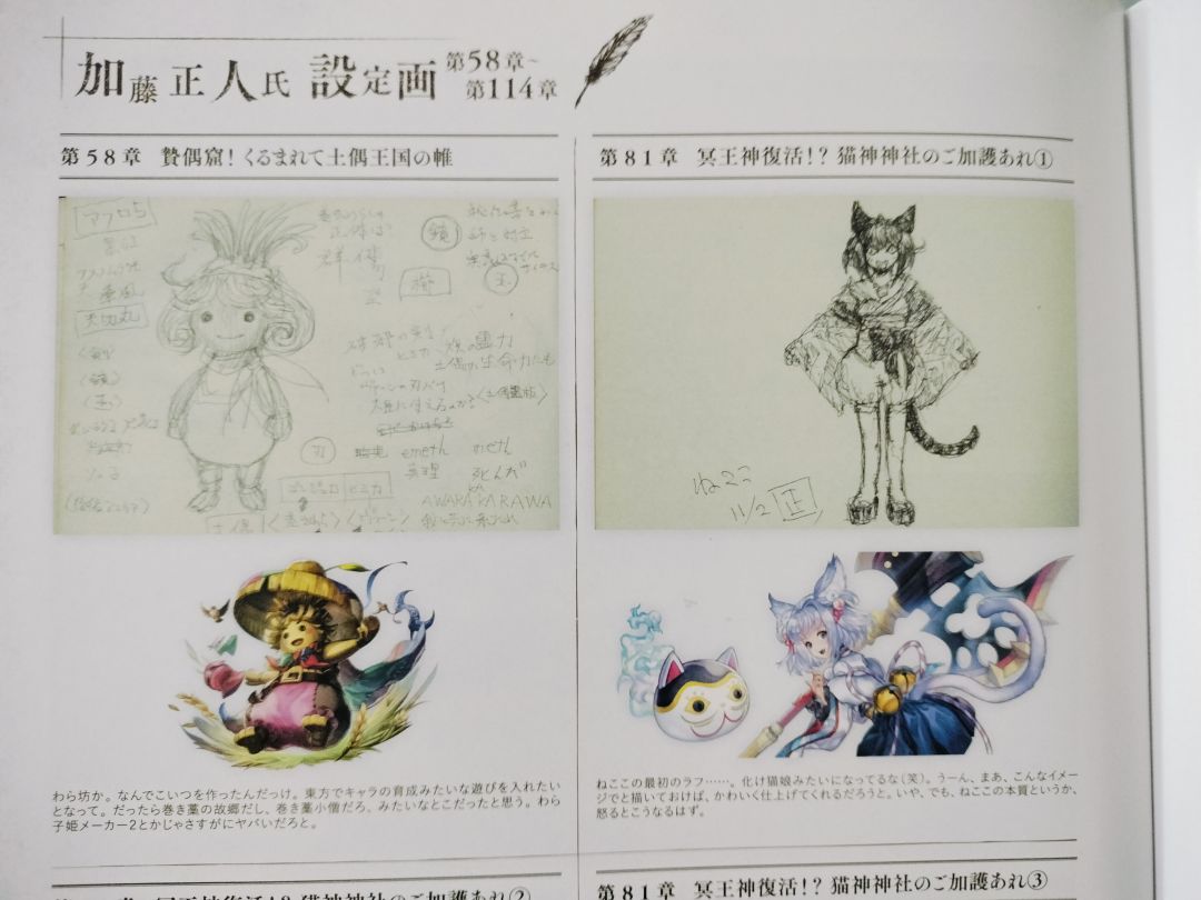 右:猫可可最初的样子...像化猫娘一样(笑)。嗯,如果用这样的形象来画的话,应该会画得很可爱吧(这里该是指草稿变成品)。不,但是,猫的本性应该是这样,生气的时候会这样。(应该是指猫可可变猫妖型态的时候)