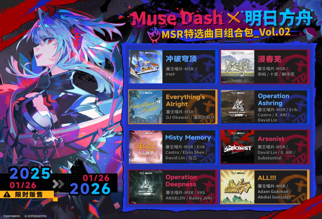 好得不能再好了!Muse Dash × 明日方舟二次联动曲包「MSR特选曲目组合包_Vol.02」全 8 首联动曲公开!新增「ALL!!!」和「Misty Memory」,尽显投资大成功后衣锦还乡之风范 ( -`ω-)✧