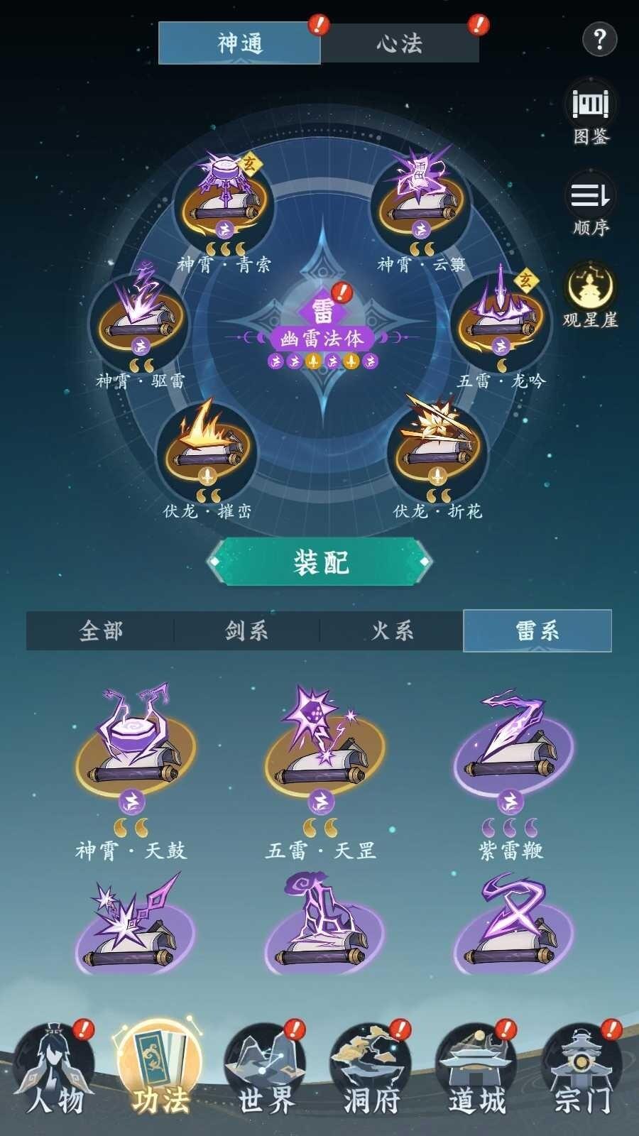 至于法术的升级,玩家只需在首页点击底部的功法选项即可进入。在功法界面中,玩家最多可以装配六种神通,而能够解锁的神通数量则取决于主线师门任务的进度。点击空置的装配槽,玩家可以安装新的神通。为了提升神通的威力,玩家可以通过推演或修行来进行强化,当神通等级达到10级时,还可以使用神通精艺进行突破,从而解锁更强大的能力。