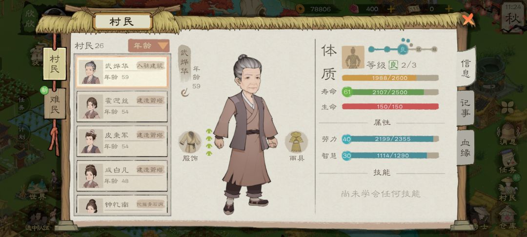 什么时候该准备加人可以看村民年龄那一栏,比如只有一两个村民没几年活头就收留流民就好,大批年纪差不多的到55岁后就可以配对年轻村民生小孩,有些住好久都做不成夫妻可能是近亲或者就是没看对眼,马上换一个,房子里村民点开有单身状态的就可以配对,好笑的是黄昏恋他们凑对特别快一配一个不吱声