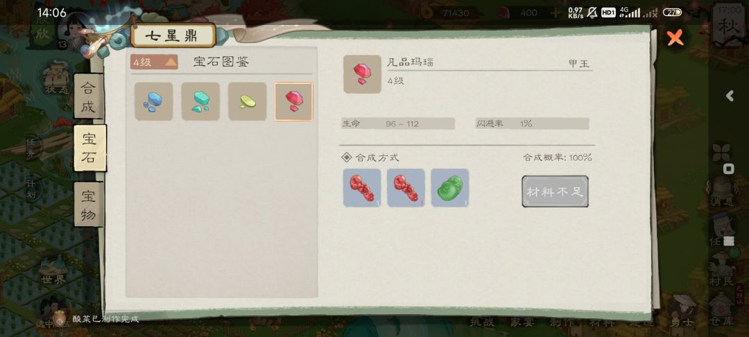 七星鼎合成宝石,普通的三个合成一个,4级合成配方可以看第二栏宝石图鉴,高级的都给先挑给小青,仇恨系数影响不大的只要她不是队长基本都是乔河冲在最前面先受伤死掉