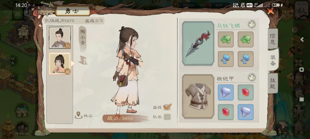 优先升级小青的装备和宝石,提升攻击力和防御值,队长记得选乔河,队长是冲在最前面的,小青比较脆,战损后队长会变更记得换回来