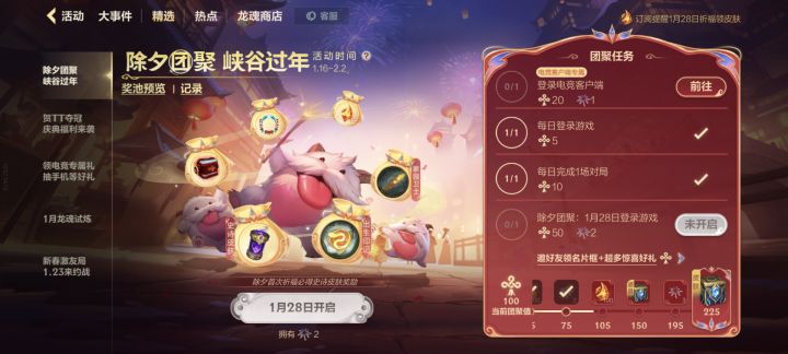 💜宝箱3️⃣【除夕团聚】1月16日~2月2日,每日首胜累计积分至225分,除夕起开始领取。可得“分路随机宝箱”!(切记积分要到225分哦~😊)