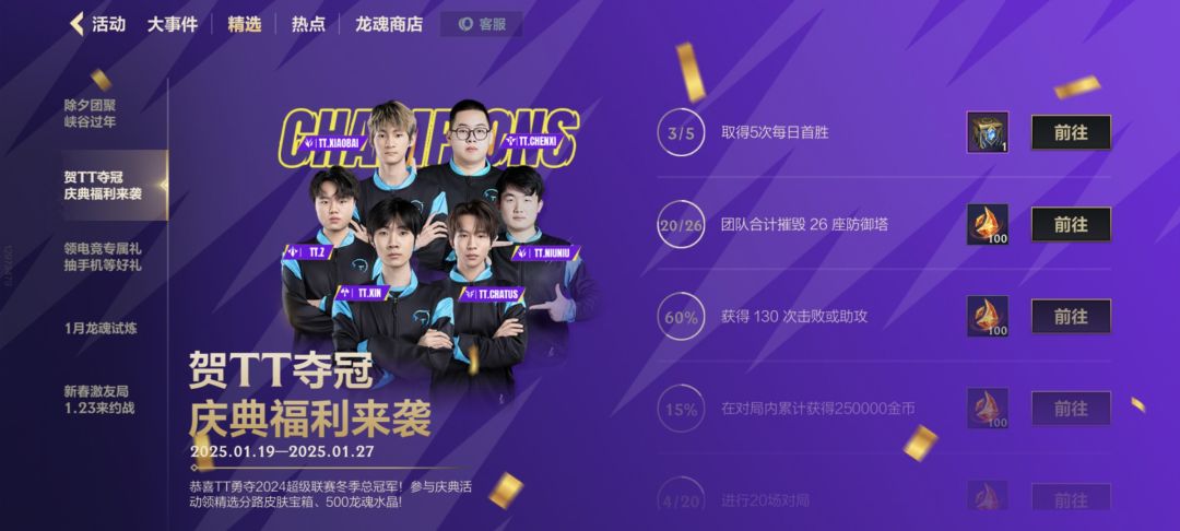💜宝箱5️⃣【庆祝TT夺冠】1月19日~1月27日完成5日首胜可得“分路随机宝箱”!(可打一局人机先得首胜😬)