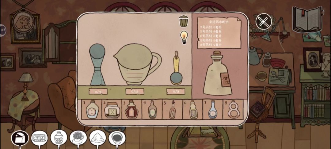 **幸运药水:来到女生1917年,点击窗台上的药剂开始制作幸运药水,将大量杯放入中间位置,将量勺放入大量杯中,按照幸运药水配方,配出幸运药水(配比过程视频放在下方)。