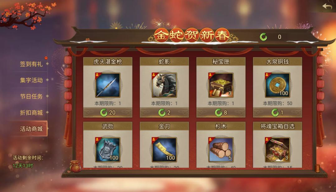1、活动期间,收集春节限时道具“灵蛇玉”可在活动商店兑换 宝物-【虎头湛金枪】、生肖坐骑-【蛇影】 等道具奖励!