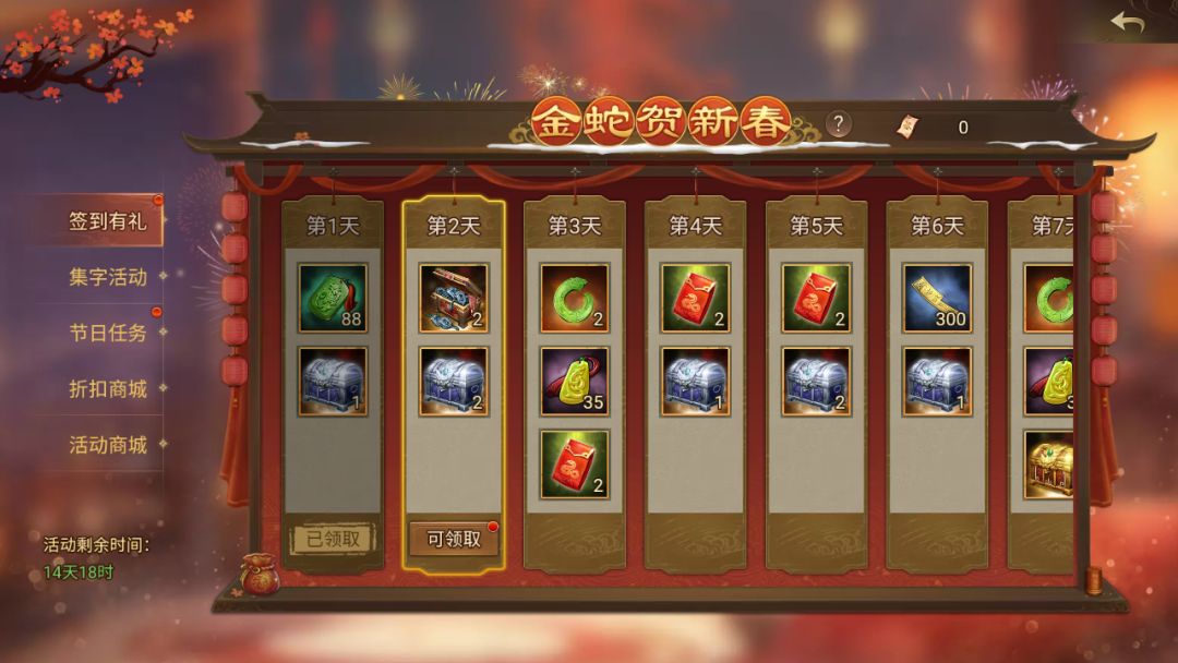 1、每日任务:活动前三天,每日将开放三个任务,活动期间均可完成任务,完成任务可即可领取 大泉铜钱、活动道具“灵蛇玉”、集字宝箱 等奖励!