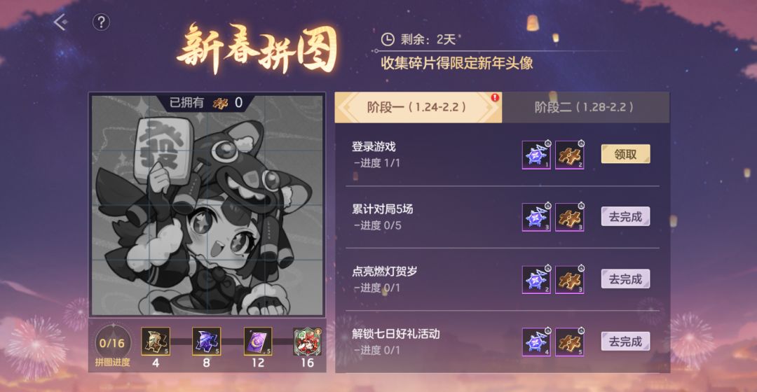 完成任务获取冰雪令牌和拼图碎片,拼图碎片用于点亮拼图。点亮指定数量的拼图后,可以获得新款限定头像新春迎财、寻宝签、皮肤碎片等奖励