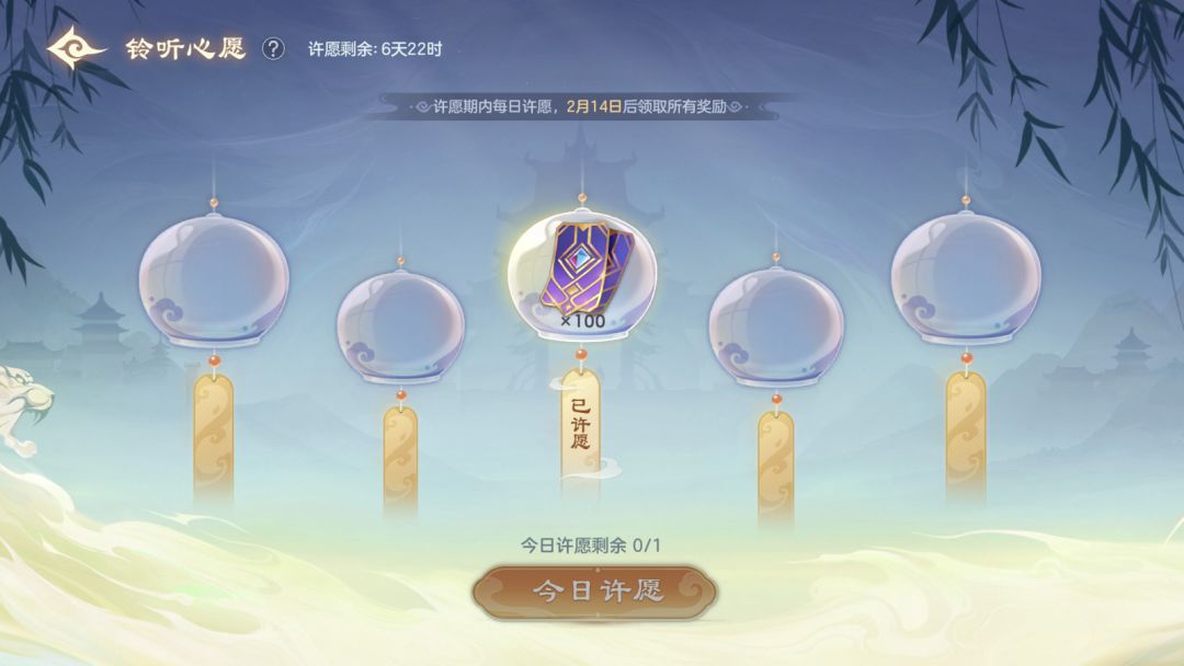 在许愿期内每日登录可许1次愿望,最多可许5个愿望。可以许下的愿望有礼券*100、龙魂祈福卡*5、风铃头像自选箱、风铃头像框自选箱、5级绘卷经验包、皮肤碎片等。