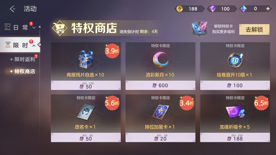 解锁特权卡,享受超值折扣,使用礼券购买流彩新月、龙魂祈福卡、排位加星卡、改名卡等多种福利
