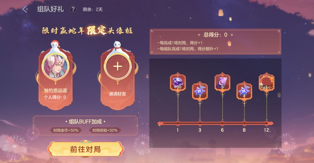 完成对局获得得分,与小队成员共同对局更有额外得分奖励。可根据总得分领取新款限定头像框爆竹声声、冰雪令牌、寻宝签等奖励