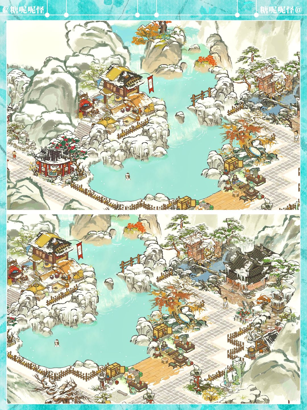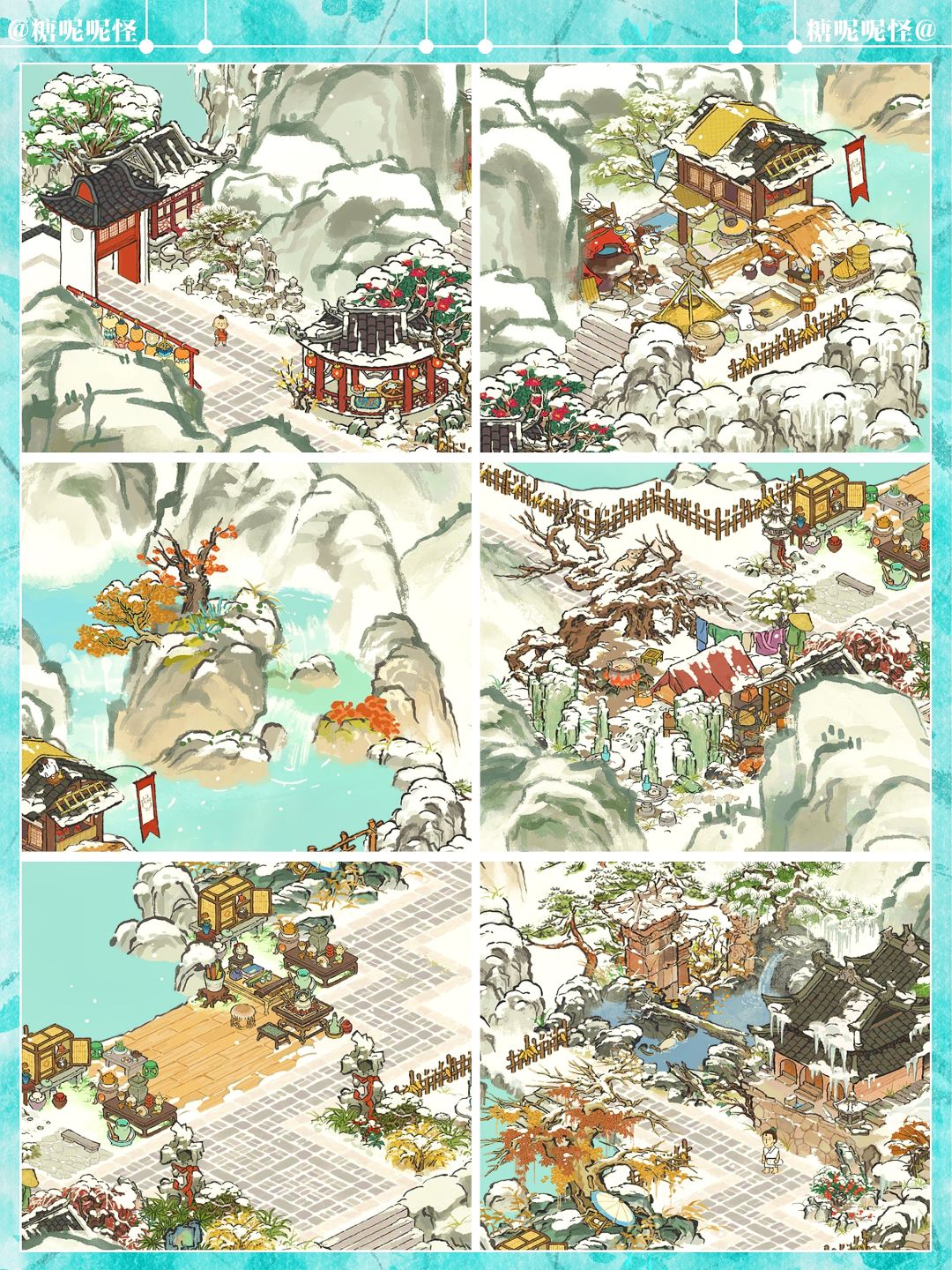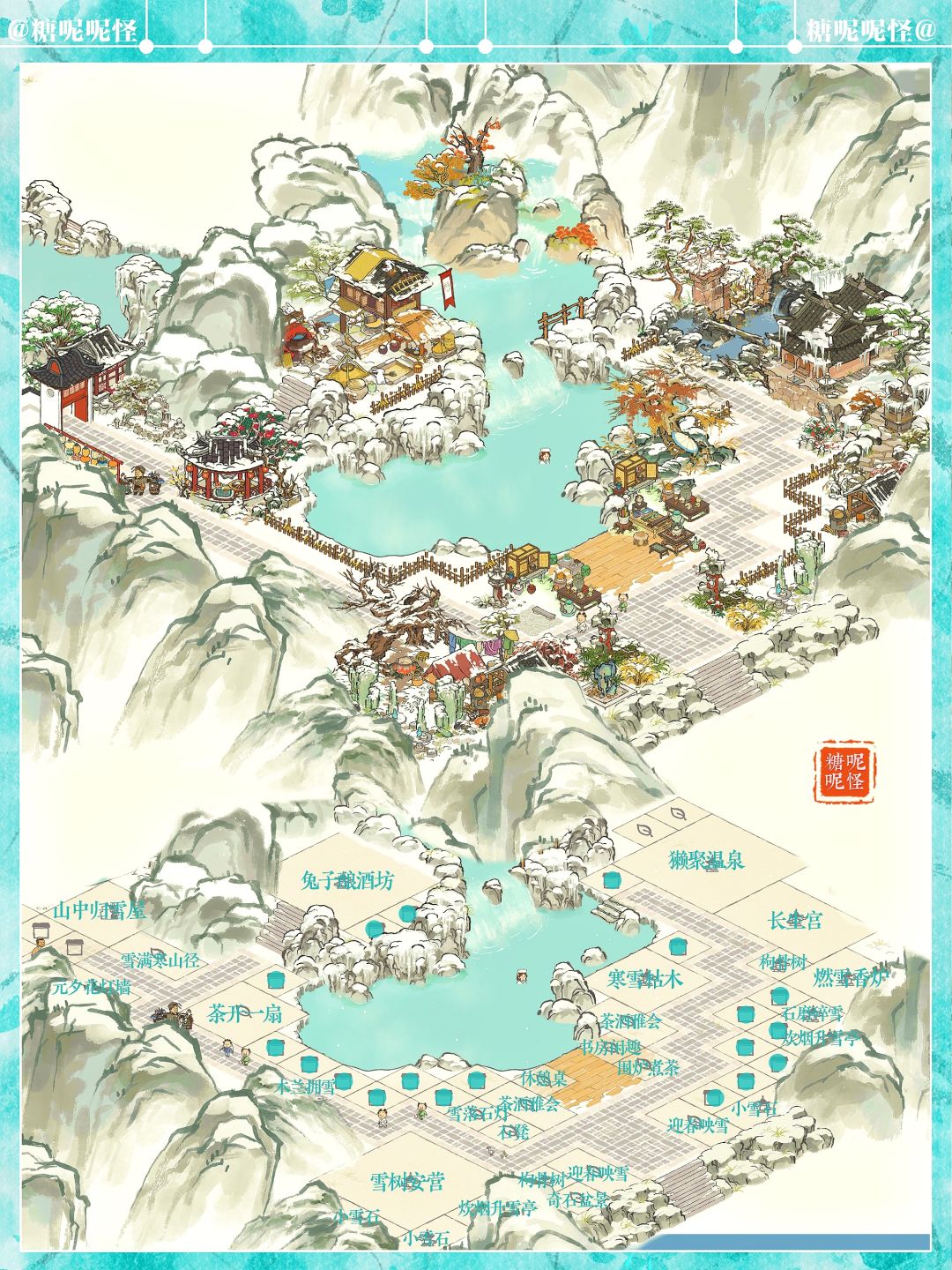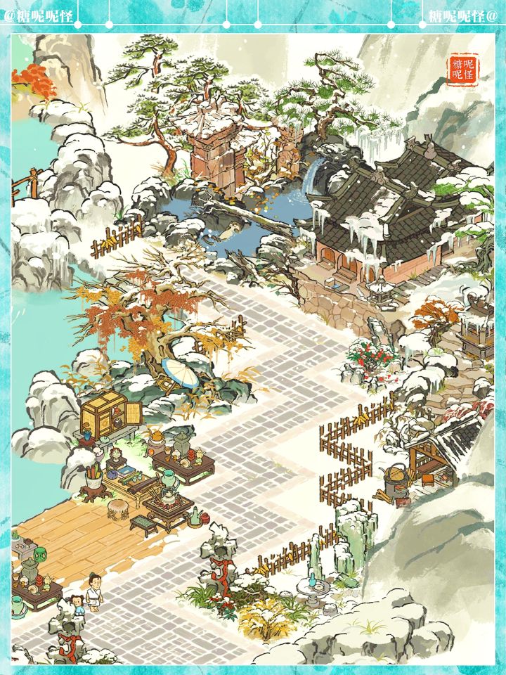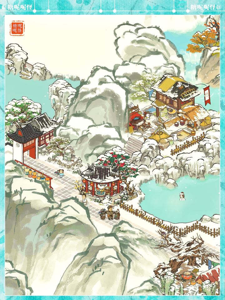 建筑:獭聚温泉|长生宫|雪树安营|寒雪枯木|兔子酿酒坊|燃雪香炉|炊烟升雪亭|迎春映雪|雪满寒山径|茶酒雅会|茶开一扇|山中归雪屋