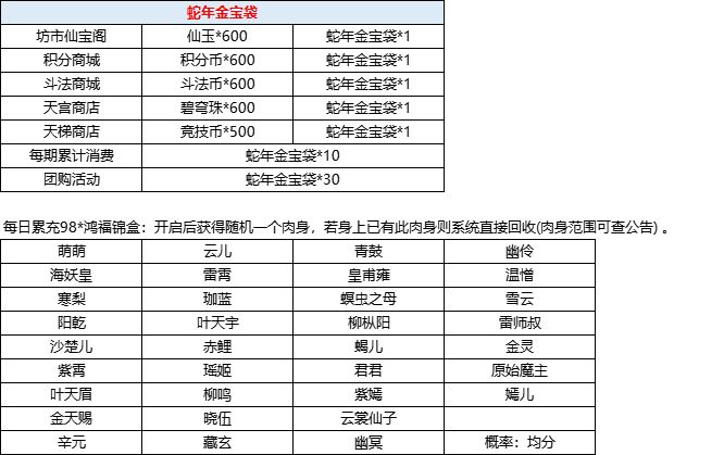 a.蛇年金宝袋(道具描述:使用之后,随机获得超级稀有金色法宝的残片。)投放方式可看下文详情