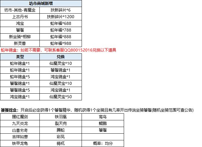 2.喜迎新春,坊市商城新增:青魔金、上古丹书、鸿宝、饕餮、新坐骑*相柳、新灵兽兑换