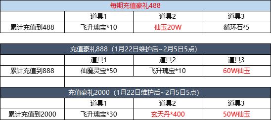 4.喜迎新春,充值豪礼488、充值豪礼888、充值豪礼2000仙玉大放送,合理累充2000可获得累计百万仙玉,详情可看下文