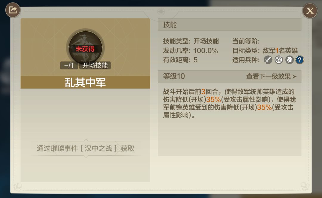 战斗开始后前3回合,使得敌军统帅英雄造成的伤害降低(开场)35%(受攻击属性影响),使得我军前锋英雄受到的伤害降低(开场)35%(受攻击属性影响)。