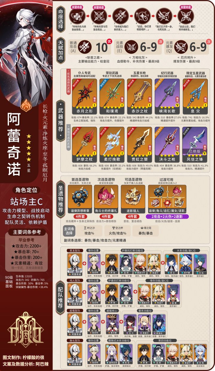 一张图带你搞定仆人·阿蕾奇诺的圣遗物、武器、配队、天赋加点、参考面板、命座选择等一系列问题~