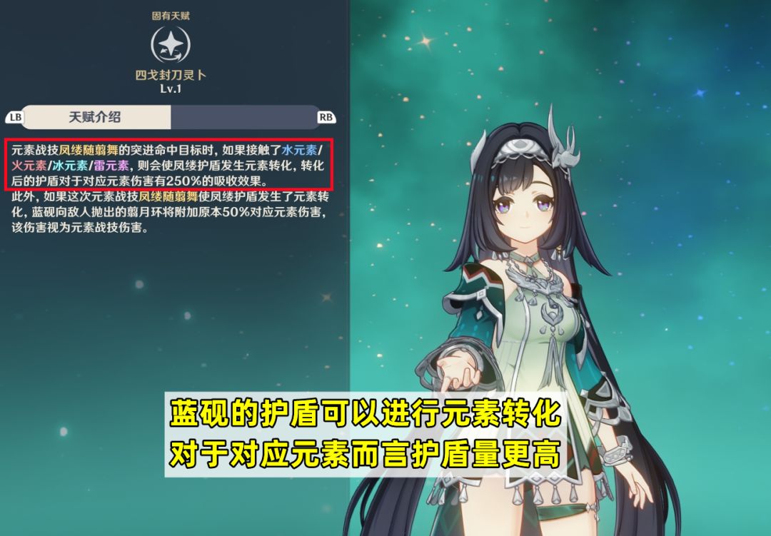 【配队思路】蓝砚的配队思路一般是搭配普攻为主,或者火/水/冰/雷元素的主C,作为盾辅提供护盾(抗打断)和减抗。另外蓝砚的护盾还可以进行元素转化,对于对应元素而言护盾量更高。