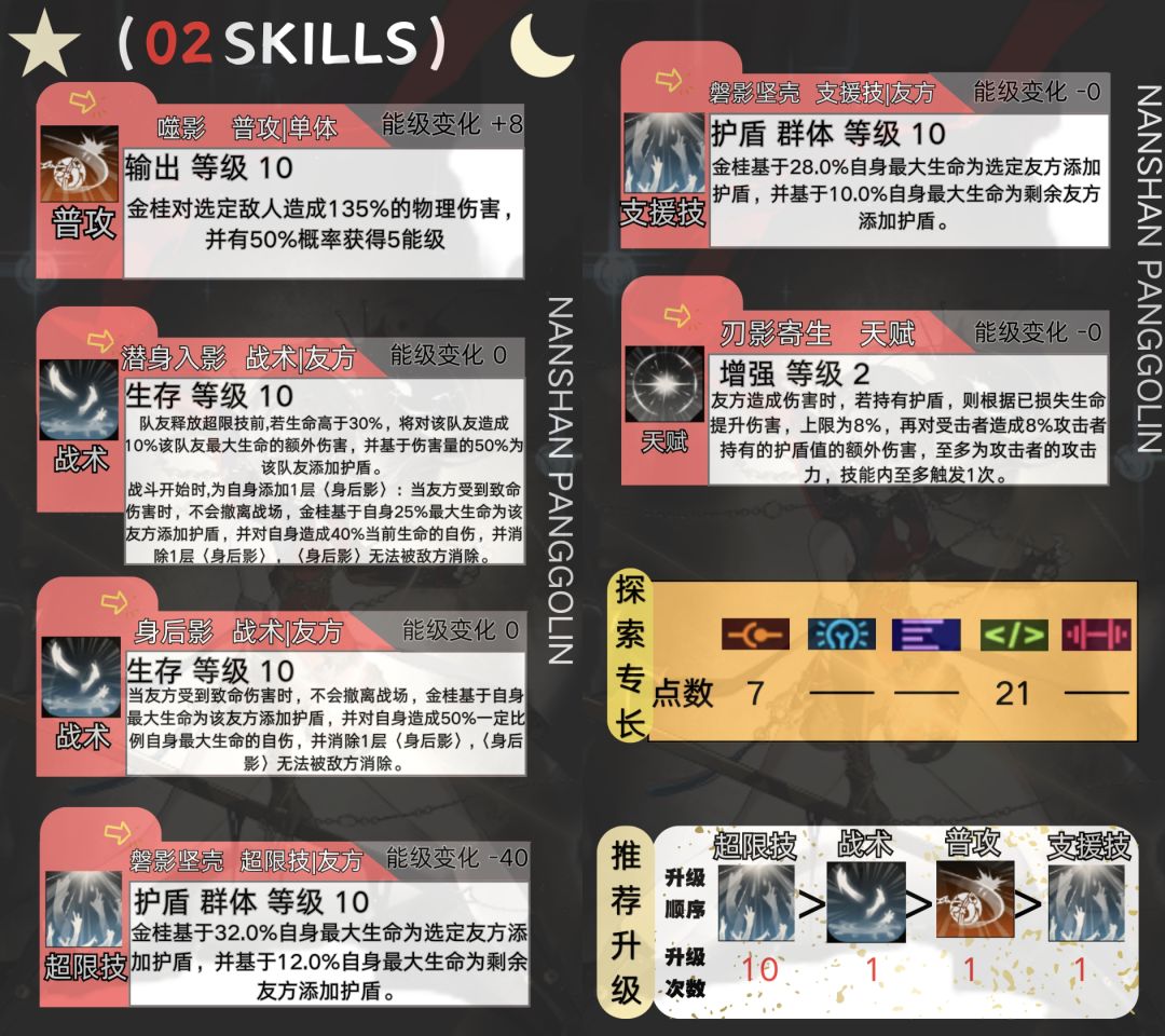 推荐先点满超限技,让金桂为全体带来的护盾量提升,战术属于被动技能,提升效果并不大。普攻主要用来增加能级,所以可以不用升级。